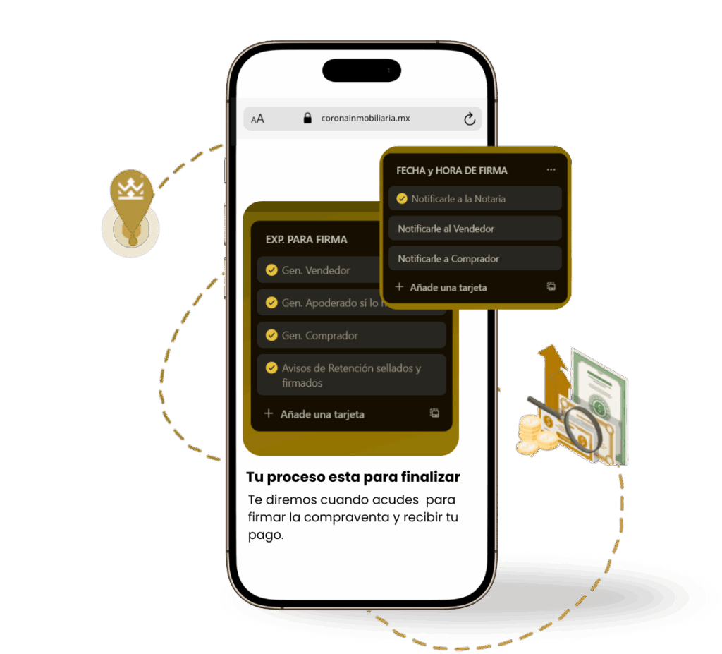 Una vez que aceptas la estrategia, nos encargamos de todo el proceso: desde la promoción de la propiedad, seguimiento con interesados, gestiones legales y notariales, hasta la formalización de la venta.